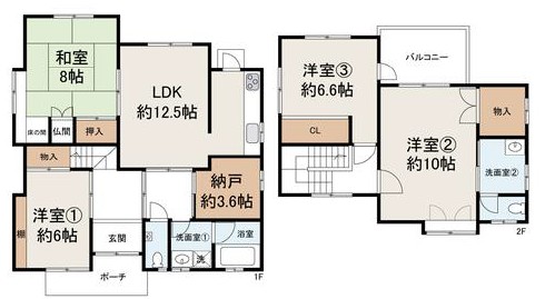 2階には、約10帖の洋室と約6.6帖の洋室があり、1階、2階、それぞれにトイレと洗面室があるので、忙しい朝の支度や来客時にも大変便利ですね。