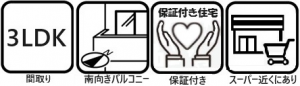 設備・条件 | 保証付住宅 システムキッチン 給湯 独立洗面台 室内洗濯機置き場 オートロック TVドアホン 都市ガス 公営水道 排水下水 エレベータ バルコニー 【設備その他】 |
