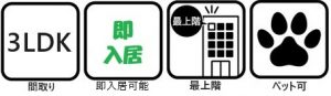 | 設備・条件 | ペット可能 三口コンロ システムキッチン 給湯 追い焚き 洗髪洗面化粧台 独立洗面台 温水洗浄便座 室内洗濯機置き場 オートロック TVドアホン 都市ガス 公営水道 排水下水 エレベータ 駐輪場 バイク置き場 バルコニー 【設備その他】 |