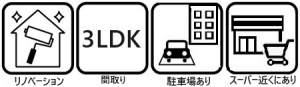 | 設備・条件 | リノベーション システムキッチン カウンターキッチン 給湯 独立洗面台 室内洗濯機置き場 TVドアホン 都市ガス 公営水道 排水下水 エレベータ 駐車場有 出窓 バルコニー 【設備その他】 |