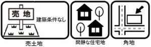 | 設備・条件 | 角地 建築条件無 都市ガス 公営水道 排水下水 【設備その他】 |