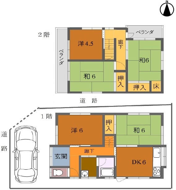 2階には6帖の和室が2部屋と4.5帖の洋室があります。