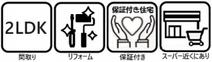 | 設備・条件 | 保証付住宅 リノベーション 給湯 独立洗面台 室内洗濯機置き場 オートロック TVドアホン 都市ガス 公営水道 排水下水 エレベータ バルコニー フローリング 【設備その他】 |