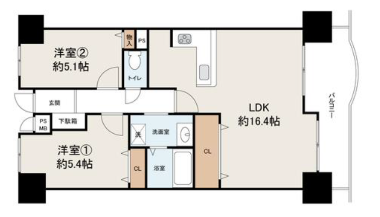 11階建ての2階部分、専有面積は61.06㎡、間取りは2LDKのお部屋になります。