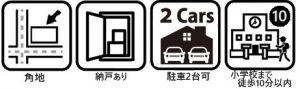 | 設備・条件 | 角地 給湯 独立洗面台 納戸 室内洗濯機置き場 プロパンガス 公営水道 排水下水 バルコニー 【設備その他】 |