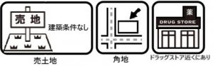 | 設備・条件 | 角地 建築条件無 都市ガス 公営水道 排水下水 【設備その他】 |
